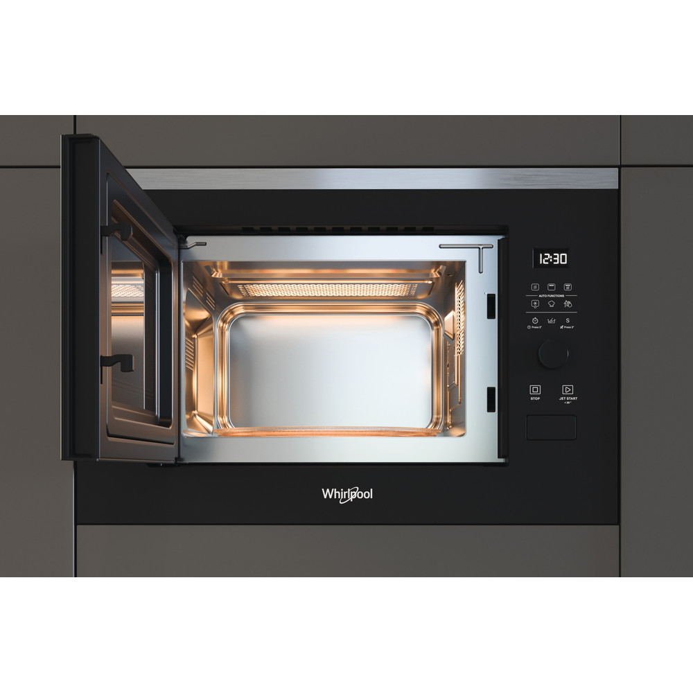 Las características de este microondas de encastre Whirlpool: color acero inoxidable. Función Gill. JetDefrost para una descongelación extraordinariamente rápida y homogénea.