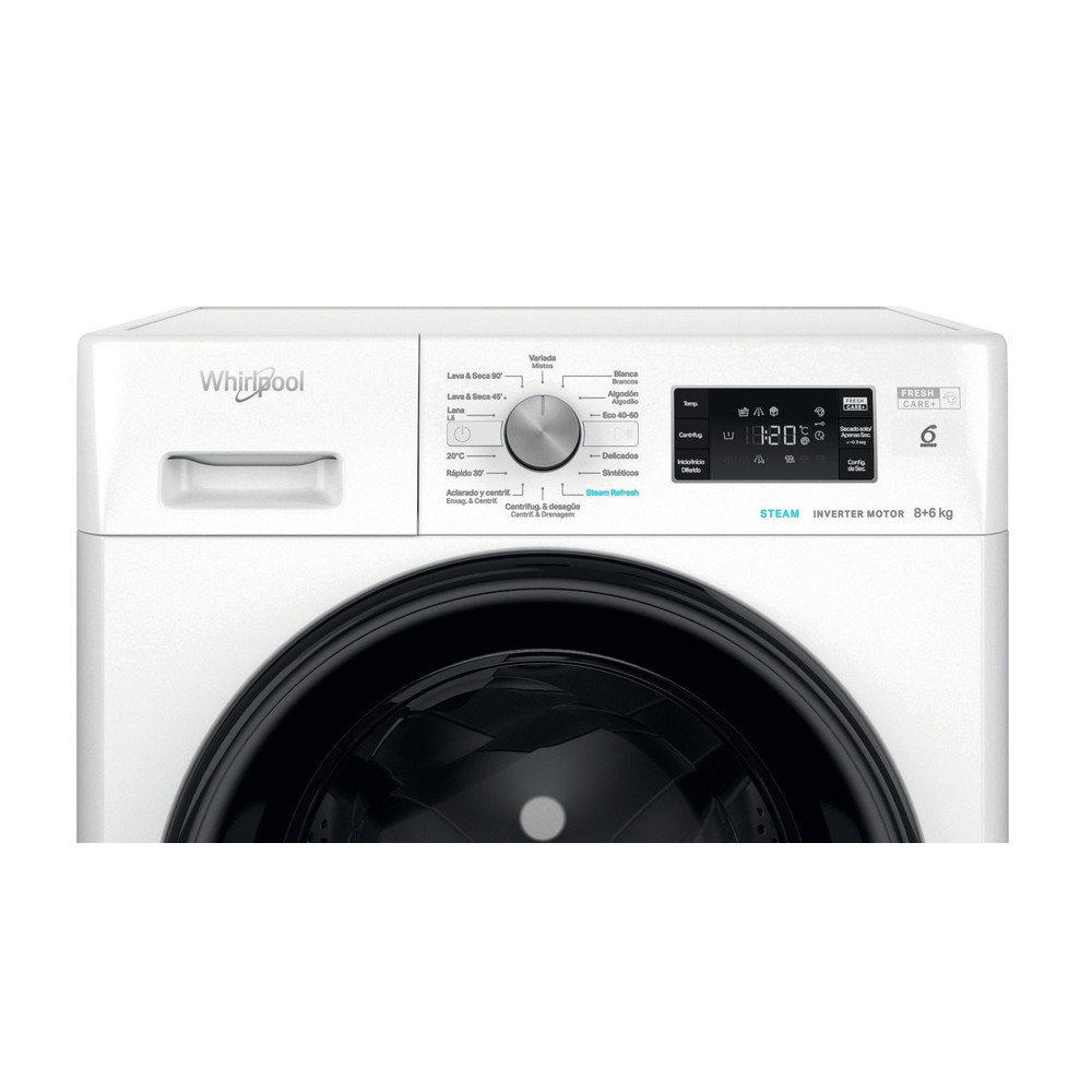 Las características de esta lavasecadora de libre instalación Whirlpool: color blanco. Extraordinaria capacidad de lavado de 8,0kg Gran capacidad de secado de 6,0kg. Exclusiva tecnología 6th SENSE que constantemente monitoriza la humedad en el tambor, protegiendo tu ropa y garantizando perfectos resultados de lavado y secado. Rápida y eficiente velocidad de centrifugado de 1400 revoluciones por minuto.
