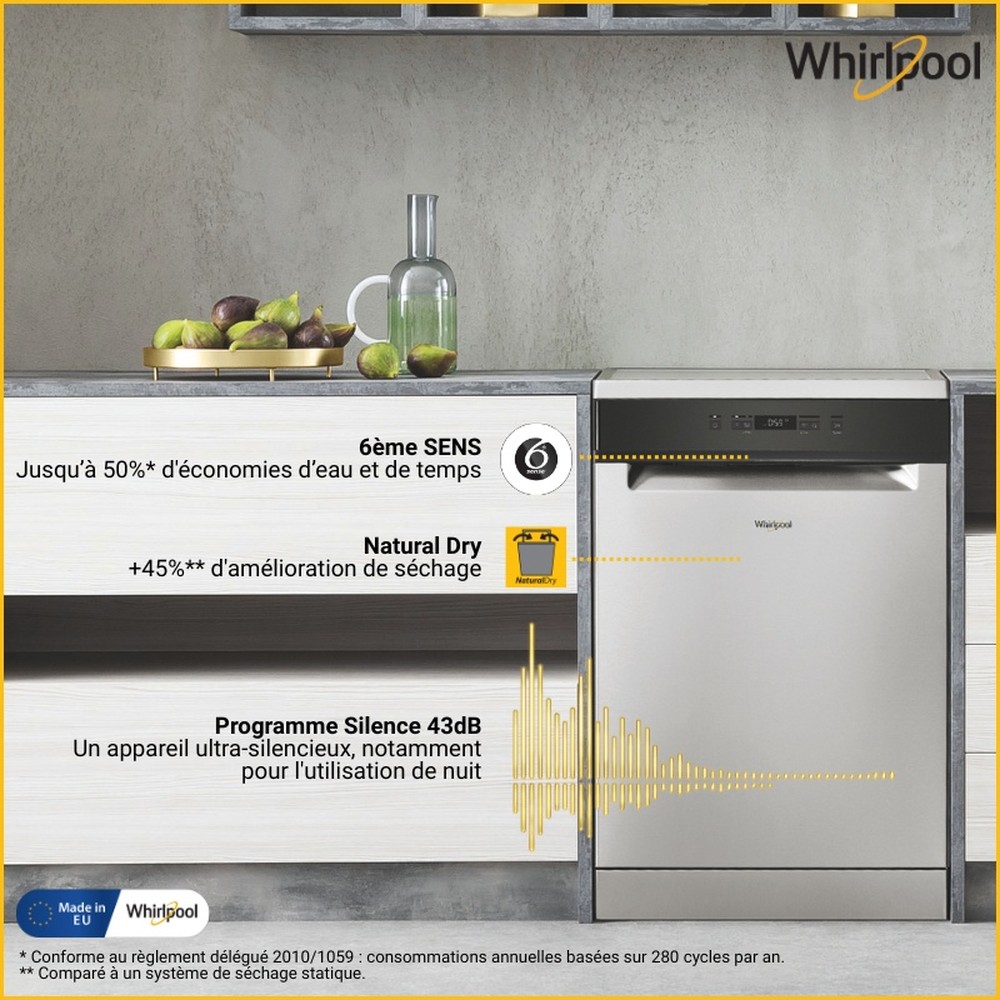 Características de este lavavajillas Whirlpool: color inox. Clase de eficiencia energética D. Pies ajustables, para una estabilidad perfecta en suelos y superficies irregulares. Práctico temporizador digital, que te avisa cuando el ciclo de lavado termina. Tecnología innovadora que asegura un rendimiento muy silencioso, para un electrodoméstico muy silencioso.